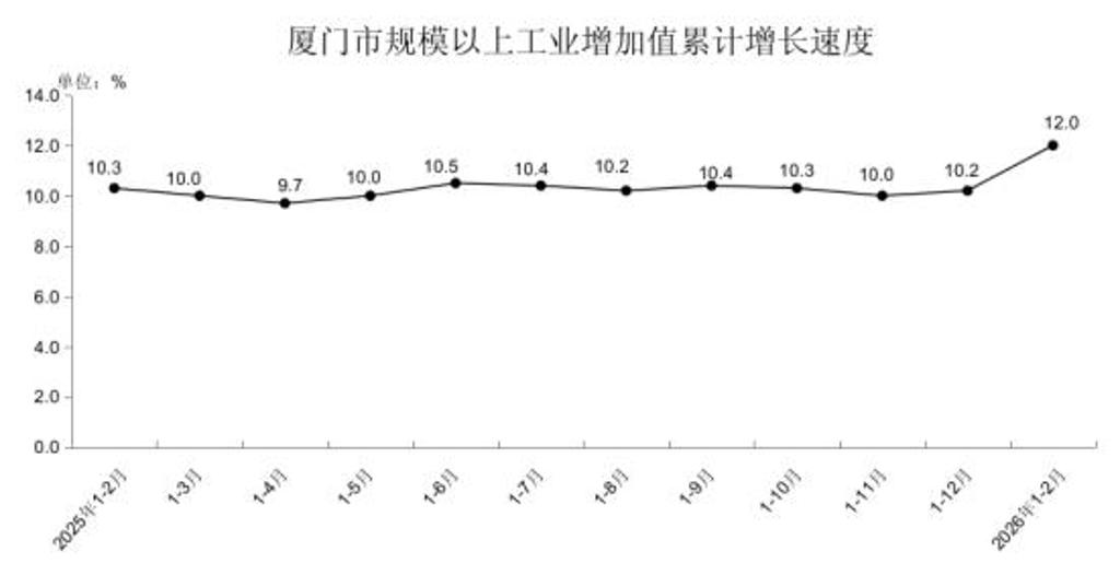 1-2月,厦门市工业经济延续上年的良好发展态势,增长动能持续增强,全市规模以上工业增加值比去年同期增长12.0%。