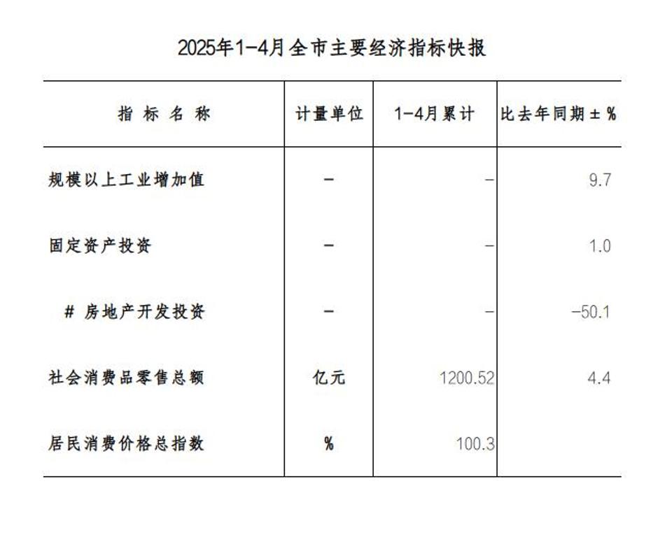 2025年1-4月全市主要经济指标快报