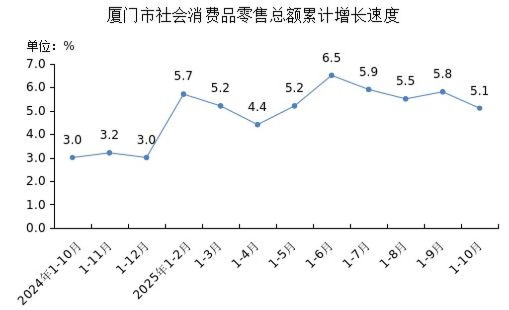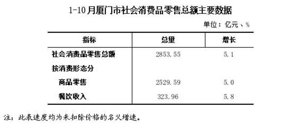 1-10月,全市实现社会消费品零售总额2853.55亿元,增长5.1%(名义增长,下同)。