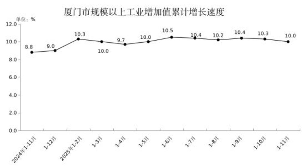 1-11月,厦门市规模以上工业增加值比去年同期增长10.0%。