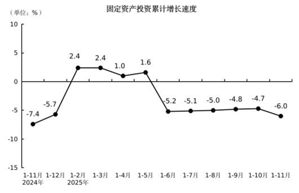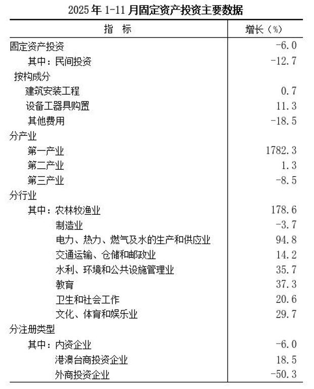 2025年1-11月,全市固定资产投资比去年同期下降6%。其中,民间投资下降12.7%。