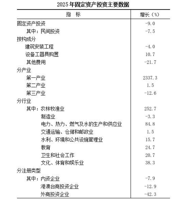 2025年,全市固定资产投资比上年下降9.0%。其中,民间投资下降7.5%。