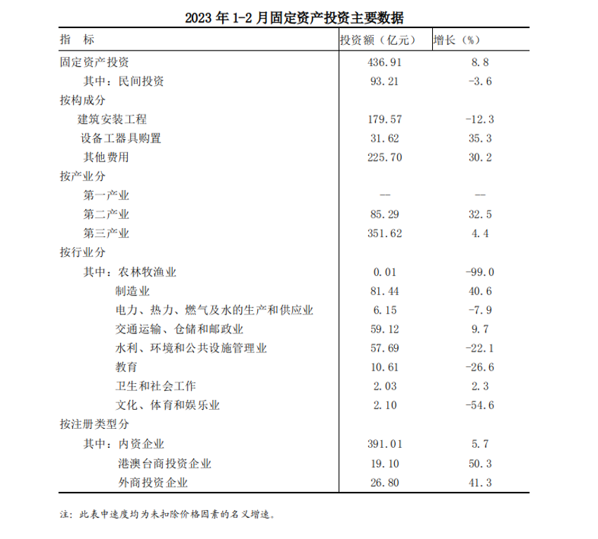 2023年1-2月,全市固定资产投资436.91亿元,比去年同期增长8.8%。其中,民间投资93.21亿元,下降3.6%。
