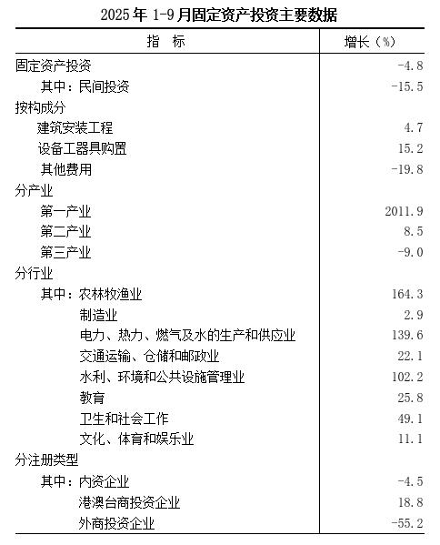 2025年1-9月,全市固定资产投资比去年同期下降4.8%。其中,民间投资下降15.5%。